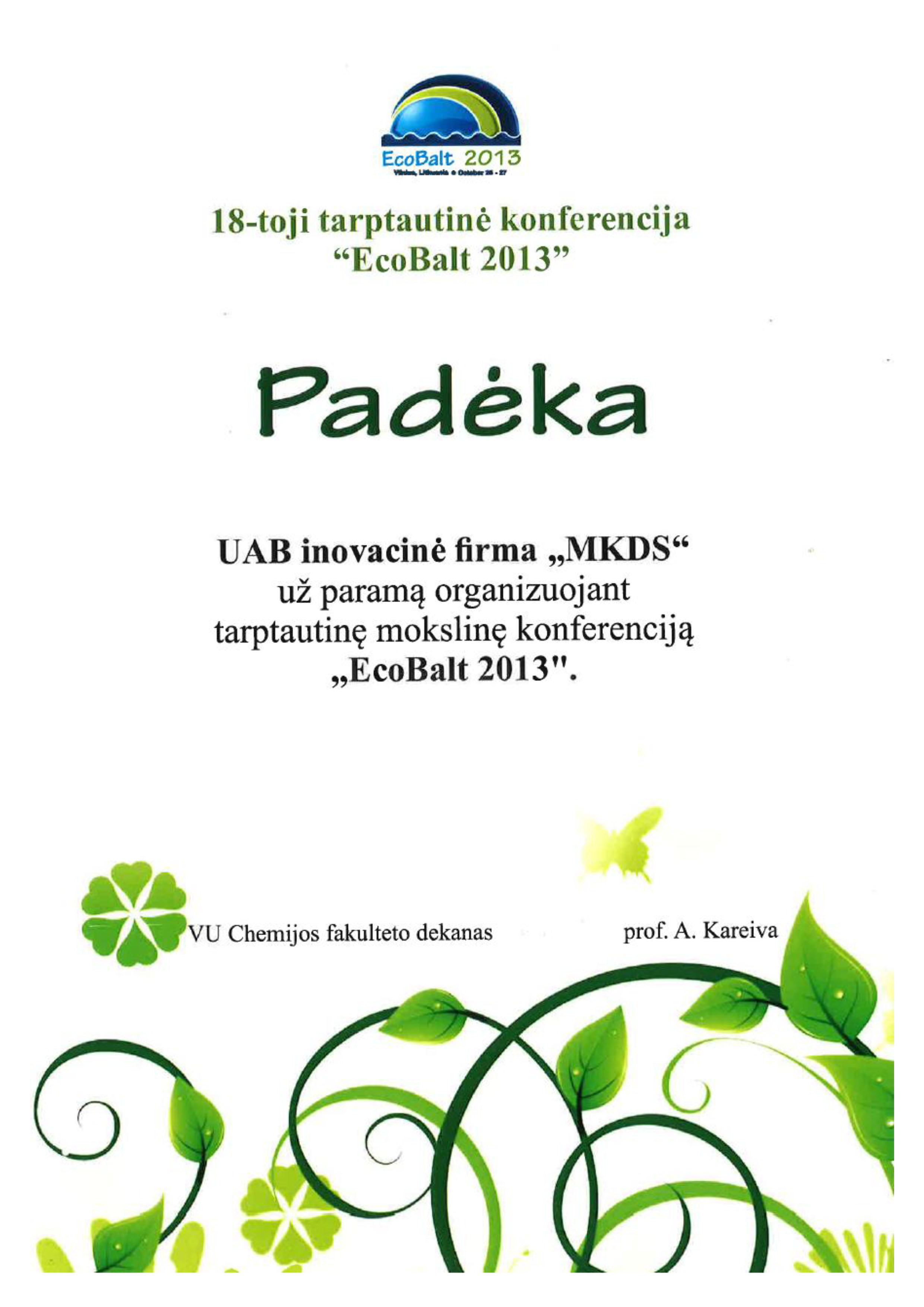 Padėka UAB inovacinei firmai „MKDS“ buvo įteikta 2013 m. už paramą organizuojant 18-ąją tarptautinę mokslinę konferenciją „EcoBalt 2013“.