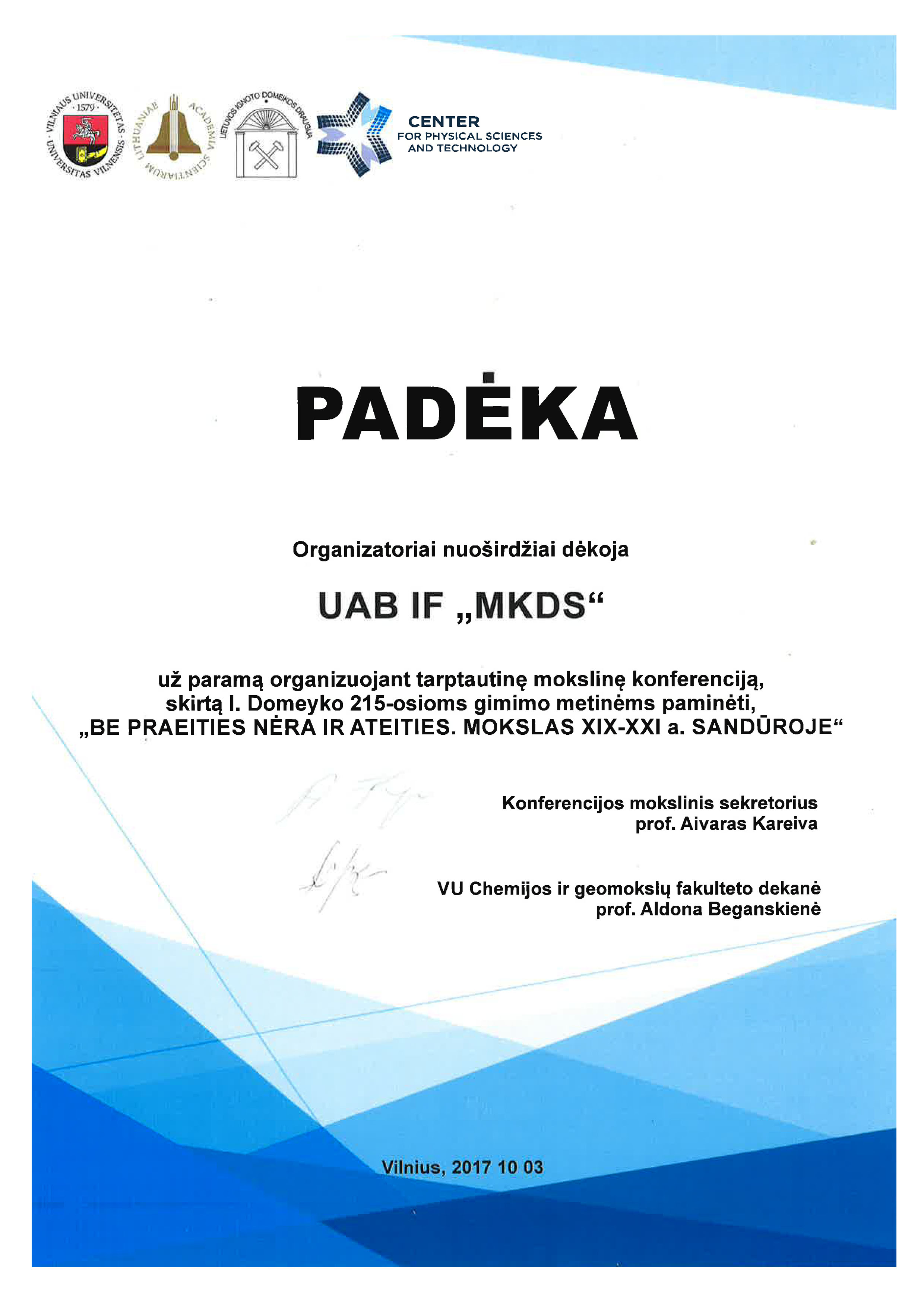 Padėka UAB inovacinei firmai „MKDS“ buvo suteikta už paramą organizuojant tarptautinę mokslinę konferenciją, skirtą I. Domeyko 215-osioms gimimo metinėms paminėti. Konferencija vyko Vilnius University, ją organizavo Chemijos ir geomokslų fakultetas bei Fizinių ir technologijos mokslų centras. Renginys buvo skirtas mokslo raidai aptarti, akcentuojant XIX–XXI amžių sandūrą, o įmonės indėlis prisidėjo prie sėkmingo konferencijos įgyvendinimo. Padėką įteikė konferencijos organizatoriai – mokslinis sekretorius prof. Aivaras Kareiva ir fakulteto dekanė prof. Aldona Beganskienė.