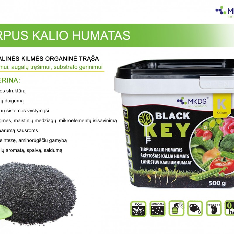 BLACK KEY skirtas visiems žemės ūkio, sodo, daržo, dekoratyviniams augalams, vaismedžiams, vejoms bei ganykloms, substratų ruošimui, hidroponikai. Dirvožemio gerinimui, šaknų sistemos vystymuisi, derlingumo didinimui.
