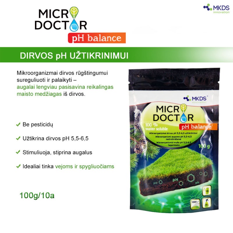 lakmuso juosteles. Tačiau Microdoctor pH balance 5,5-6,5 ir be iš anksto nustatyto dirvos pH, subalansuoja dirvos rūgštingumą ties pH 5,5-6,5, o tai idealiai tinka vejoms ir spygliuočiams.