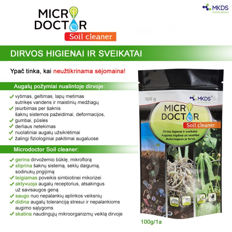 Microdoctor Soil cleaner dirvos higienai ir sveikatai. Ypač rekomenduojame naudoti kur nėra galimybės taikyti nuolatinę sėjomainą. Produktas universalus – tinka kambario ir lauko augalams. Nesilaikant sėjomainos, dirva stipriai nualinama, tampa sunku kontroliuoti bakterines ir grybines ligas, kenksmingų organizmų plitimą. Daugiau apie sėjomainos reikšmę augalams skaitykite straipsnyje Kas yra sėjomaina? Microdoctor soil cleaner formuoja sveiką dirvos mikroflorą. Sveika dirva skatina greitesnį dygimą, augimą, šaknų vystymąsi – sveikesni augalai.